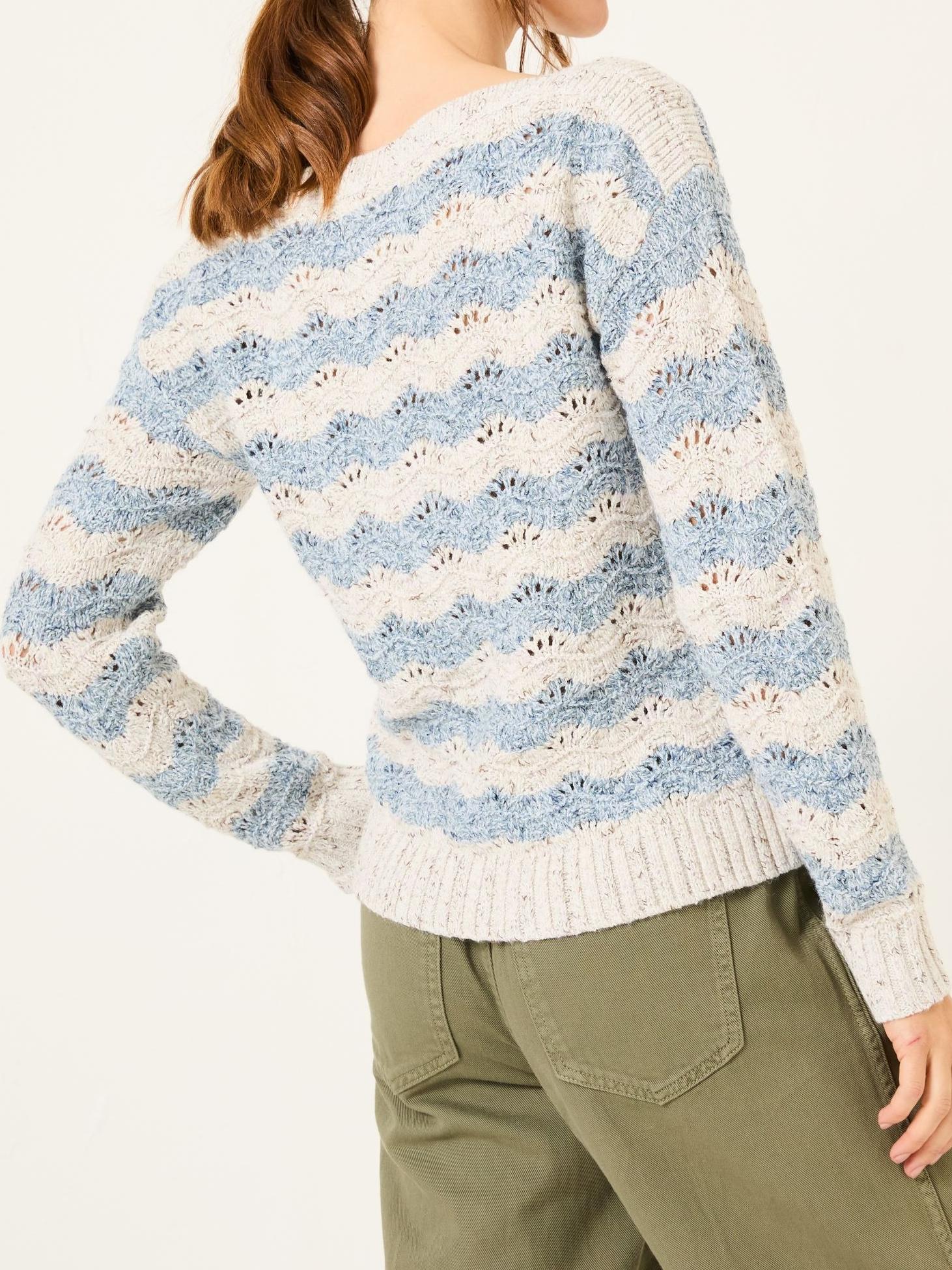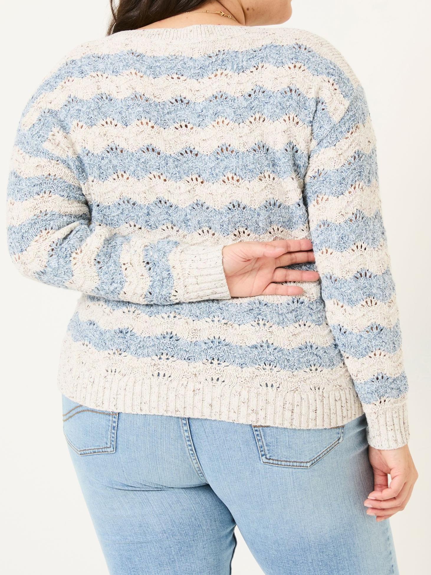 Our Edith Crew Neck Jumper is a textured midlayer that's both warm and stylish. Finished with a wavy stripe pattern, pointelle detail and partly polyester fabric, it's a style you can wear with your favourite jeans and skirt or even layered over a plain dress.