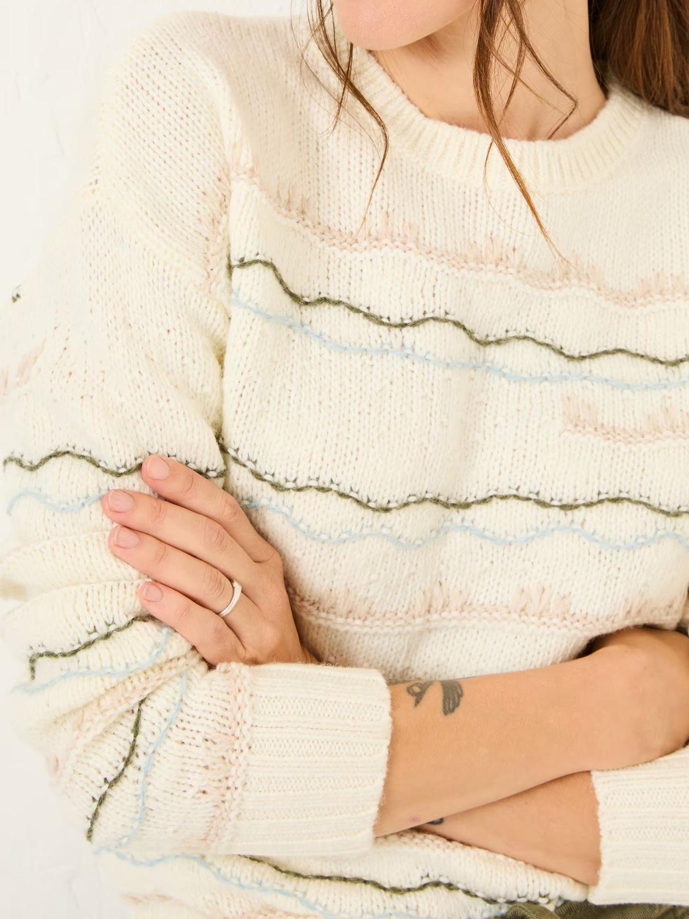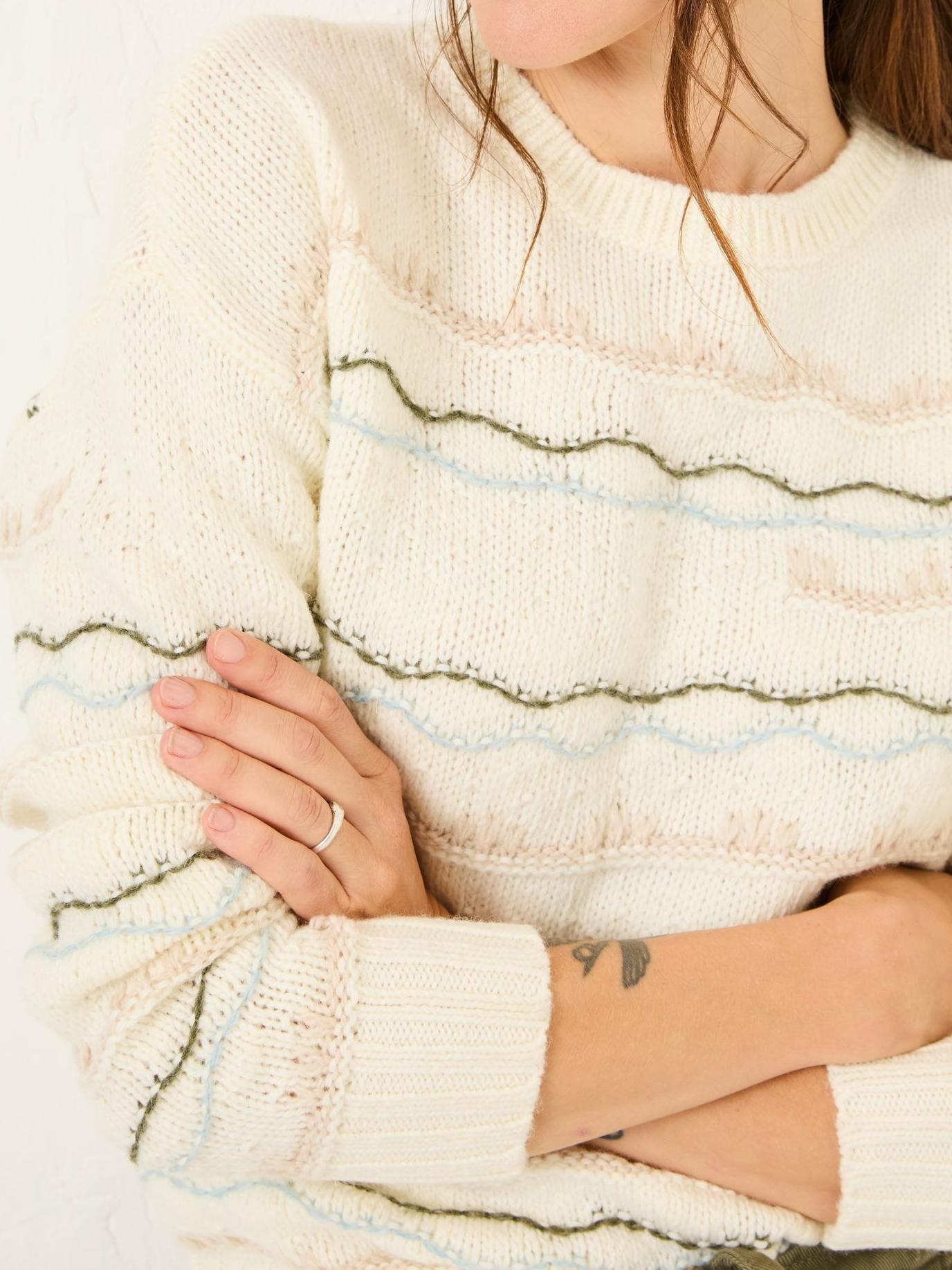 Stay cosy and stylish with our Suki pattern knitted crew neck jumper. Featuring a unique pattern, it offers a fun yet refined touch to your look. Made from a mix of soft fabrics, it's perfect for layering on chilly days. Whether you're enjoying a weekend coffee run or simply relaxing at home, it provides comfort and effortless style to your wardrobe. Pair with your favourite jeans and trainers or dress it up with a cute skirt.